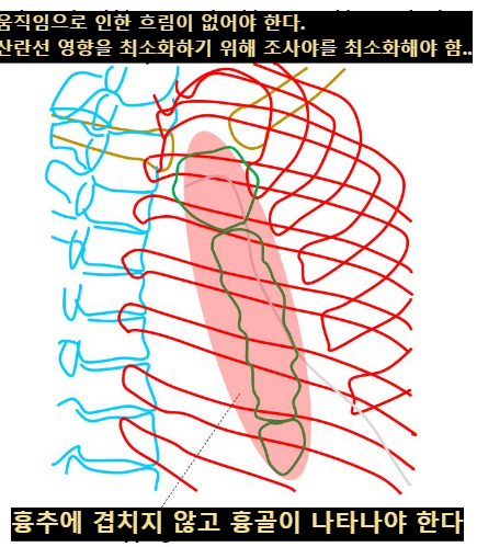 - 혹은 느린 호흡중의 장노출(3초 이상) 촬영 역시 효과적이나, 흉골의 움직임이 적은 누운 자세에서 효과적이다