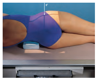 환자는 측와위(lateral recumbent position) 로 배치됩니다. 환자의 다리는 골반의 앞쪽이 가려지지 않도록 충분히 펴고, 허리 아래에 지지대를 놓아 척추가 테이블과 평행하게 유지되도록 조정합니다. 척추가 처지면 골반이 세로 축에서 기울어질 수 있으므로 주의해야 합니다.